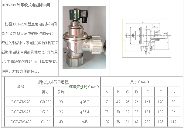 外螺纹式电磁脉冲阀,外螺纹电磁阀是一种外螺纹连接结构,是在Z型直角电磁脉冲阀基础上改进的品种。该电磁脉冲阀具有Z型电磁脉冲阀同样的灵敏度高、排气量大、工作稳定的性能,具有安装、维修方便,使用可靠的特点。